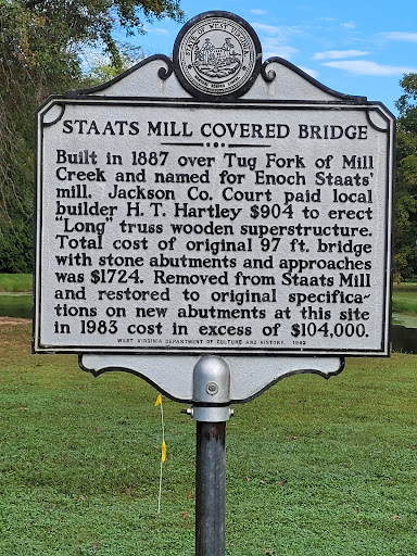 This beautiful red bridge was completed in 1887 and it originally spanned the Tug Fork of Big Mill Creek. It was named after Enoch Staats, whose water-powered mill and store anchored the surrounding community. The Staats family were early settlers, arriving around 1780. Enoch’s father, Isaac Staats, built the first mill on the site.