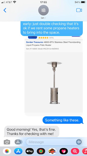 Read moreAsked in February or March if I could use tower heaters for our November wedding and was approved. Then after spending the money on them, spending the hours assembling them, then transporting them there. That was when the owners decided to “call the fire Marshall and check” and told me I couldn’t use them because of “carbon dioxide build up”…. Carbon dioxide... Dioxide. It was actually below freezing that night and pretty much forced a lot of the elderly out fairly early in the evening. Edit: I specifically said the outdoor style radiant propane tower heaters like they use in restaurants since you billed your venue as "open air" due to covid restrictions. I wouldn't have chosen your venue if I had not believed you had fully understood what I was saying. I offered to buy indoor safe UL rated heaters as well and was denied for the same reason "carbon dioxide" buildup. This response really makes me feel as though you don't really call. We could have opened the doors. The water fall was kind of sprung on us too and then was described as a short walk across a creek. And she even stated that it was to help build up yall's social media presence. Not a truly altruistic act if you ask me but I understand that and that's why you hadn't receive one star. But here's an update. We paid $2-300 for the fire after you offered it so I would hardly call that sprung on you more of just a service we paid for. I have attached the text message of you confirming we can use them for reference, in linguistics heavily indicating intention to use them inside. Some would refer to this as a bait and switch but I will more kindly refer to it as a...
