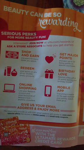 Read moreSo I was in the store yesterday and there's these little heart signs on all these shelves throughout the store that say 50% off skin care products and it has a little QR code. Nothing is 50% off unless you purchase it on the correct day, according to the girls at the registers. So apparently you have to click on the QR code and read which day you can get the 50% off price and have to go back to the store to purchase your product. Now none of the little signs explain this they just advertise the 50% off. I was not the only one confused. Even some of the employees that I talk to were confused. The way it looked in the store was there anything on those shelves that were skin care products were 50% off. It's obvious the rudeness of the employees was because they were tired of answering why the products were not 50% off. I witnessed this several times while I stood in the line. I was told to come back January 19 if I want my product for 50% off and I said no I'm not going to waste my time or gas to come back to the store. I was going to go buy my products from Sephora across the parking lot and I did. I will not shop at Ulta they are so rude there even one of the managers said if I find the product on the sale ad she would give me the 50% off but when it came down to doing it it did not happen. I had to wait till...