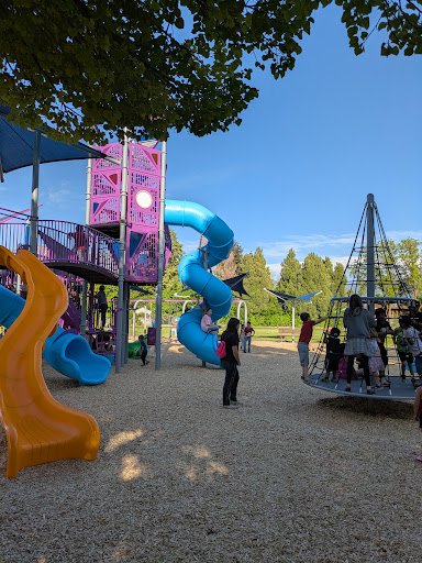 This park has big beautiful trees and a splash pad which is nice. The bathroom is located directly next to the splash pad however, there was no toilet paper and no soap in the bathroom in June which is peak season. There are currently 2 playgrounds near each other. One for little kids and one for bigger kids which is a nice touch, however, the swings are all located on the big kid play ground which makes it difficult if you have a little one. My 4 year old nearly got trampled by older kids several times while near the swings even with me standing right next to him, and of course he wanted to go on the big kid playground while we were on that side. He almost go knocked off the bridge by the older kids good thing I was standing right next to him, I had to grab him and lower him to the ground. I understand that it is not the city's fault that older kids are not careful, however, it is poorly planned to have 2 playgrounds and have all the swings on the big kid playground. I would have rated this park higher if they had swings on the little kid...