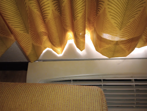 Room is in need of renovation and deep cleaning. Definitely did not feel like we were in clean surroundings especially with the filth around the A/C, tub and shower curtain which looked grungy. The mirror is loose. Tub doesn't drain well. A/C doesn't cool down the room. And at midnight there was pounding in the room next door; don't know if it was staff or the guest of course. Can't figure out any reason someone would start to pound at 12AM. We had to get up at 4:30AM too.