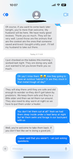 When Kristy texted me today with an update, I had more questions about their care, her response was dismissive, telling me to take the ducks back if I wasn't satisfied. She then blocked my number and posted a derogatory message about me on Facebook. With her text saying to come get them back, we will be retrieving our ducks and we will find a more suitable place for them.