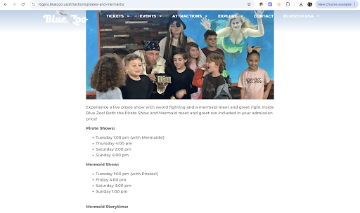 Most of our visit to Blue Zoo Rogers was deeply disappointing. We went specifically to see the 1 PM mermaid showâsomething my daughter has been asking to do since March. She even wore her mermaid costume for the occasion. I checked the website multiple times before going to confirm the schedule (see screenshot), and nothing indicated a change.
