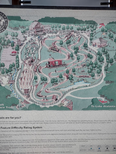 Jump heaven for mountain bikes and dirt jumpers and just about any bike you want to jump. It's roll friendly too! Take the novice line for a fun downhill ride with berks. The beginner line is legit with some nice sized jumps to try to clear and a railway car to ride though. Intermediate has slightly bigger step up type jumps. Expert has beautiful gap jumps off metal and wood. There also a lil kids pump track and wooden track to ride. 4 practice jump lines of all level difficulty. Drops in the back and of jumping isn't your things you can ride the trails around lake Atalanta. There's bathrooms, picnic tables, drink machine it's lit up at night. I've seen people host their parties there. Best part is it's...