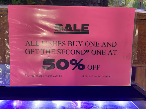 This is one of the cleanest most well cared for aquatics stores I’ve visited. I don’t know how they do it but their tanks are always pristine with no dead fish. Not a large collection of plants or hardscape but there is a good selection of fresh water fish at a reasonable price. Plus they are having a buy one get the second 50% off right now through x-mas for all fish! If I were looking for fish I would scoop up that deal. It is nice to see the fish well cared for unlike other places I’ve visited.