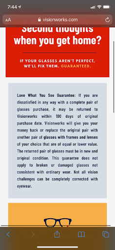 *****UPDATE**** They reached out and we were able to exchange my wife’s glasses. She is very pleased with the new pair. Just wish it would not have been dragged out like it was. ——————————————— My wife was very unhappy with a pair of glasses once we got home and she had been wearing them for about a week. She tried to get past it, but they were really uncomfortable and the quality just wasn’t what she was expecting. The company boasts about a return policy and guaranteeing satisfaction if you are not happy for ANY reason, and that they can be returned or exchanged within 100 days. Yet, we get there and they were not accommodating at all. Why have a policy if you do not actually abide by it? You can tell the integrity of a company by how they respond to negative feedback, and seeing how they intentionally did not reply to another recent negative review yet all the recent positive reviews had replies speaks volumes. We will not be back to another Vision Works.