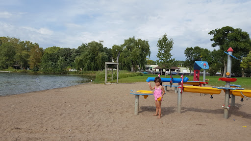 Here's what you need to know: Parking: Lot Age range (playground): 1+ Sidewalks: Paved to play area, picnic shelter, dock, and through the park (but not to the beach) Seating: Limited benches by play area Bathrooms: Located in picnic shelter Picnic tables: Several in picnic shelter with more by the beach and dock areas Grills: Located in picnic shelter and by the beach and dock areas Sports field: Open fields; dock for fishing