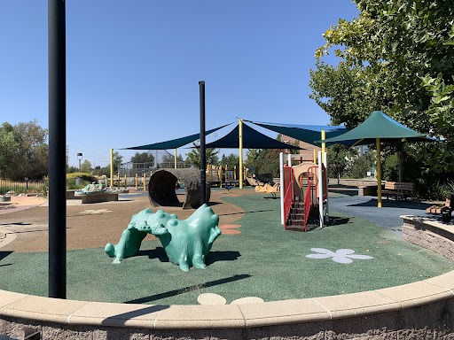 Read moreThis is a great park with two main sections. One is the gated toddler park, with low playground structures for younger kids, a sand pit, plenty of shade, and misters. The ground is that squishy rubbery material, so even if a kid falls they don't get as hurt as wood chips or asphalt. There are even a few benches and open areas under the shade canopies to lay out a picnic blanket, although there aren't any tables inside the gated area.