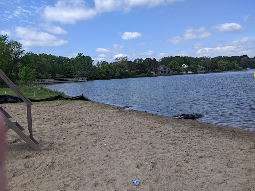 There is a picnic shelter, picnic tables, grills, bathrooms, playground, beach, fishing pier, and boat launch. Plenty of parking. Wasn't busy when we were there. Beautiful lake. Fun for the family! I've never been to a beach before that has sand&water tables like this! Love it.