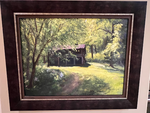 So, after considerable research, but with some apprehension, he took the painting to Noel Flynn Gallery and Frame Factory in search of the perfect frame to complete this important memory of his youth. Wow, we were not disappointed. From the moment he first stepped in the door and spoke with Elora, he knew he had found the person and place for this job. Elora is an artist and Jim immediately felt she was not there just to sell him a frame but to assist in completing his vision. She showed Jim a number of options and made several recommendations that culminated in the framed painting attached. For us, the frame captured just the right balance between the elegance we were looking for in order to showcase in our home without detracting from the rustic charm of this remote setting in Eastern Kentucky.