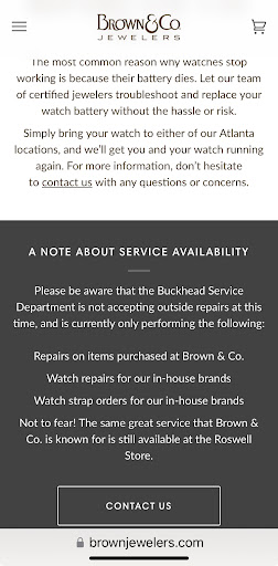 Brown & Co. Jewelers 3225 Peachtree Rd NE, Atlanta, GA 30305 Jeweler Tamara Hill 5046 points a day ago Brown Jewelers does not honor their word nor advertisements. Last night, I spent three hours attempting to purchase the David Yurman Jewelery that was listed for the prices of $2.60, $8.50 and $6.00. I even sent two emails last night and never once received a response back from anyone. This morning I called the Buckhead location and was told that there was a glitch with ordering Yurman pieces online and was then transfered by phone to the Roswell location. When the Sales Rep picked up, he said I could only purchase those pieces for those specific prices at the Roswell location. They were the only ones carrying the pieces so I made my way to the location in Roswell only to be told that those were typos on the website and the store could not honor those prices. So you don't honor what you freely advertised to the world? If there was a glitch, there is no mention of it anywhere on your website. If there were issues, why not pull the entire website offline? But no, you left these particular pieces up on your website and now you refuse to honor what you did? However, to her credit the Sales Rep at the Roswell location asked management repeatedly to review the pictures I had taken from the website, they refused her request not once but twice. Not only was I disappointed but based on the fact that you put these prices for not one piece but several on your website and then not honor them is deplorable. Do you not have any scruples? Based on how the company started and their principles you need to make this right. The last part was that I spoke to Amy who is in management at the Roswell location about the incident who profusely apologized but that is unacceptable. I then sent her the same pictures I posted here and everyone can see what I saw last night and mid morning. Your website people should be terminated and or held accountable for their mistakes but not the consumer. You are ultimately responsible for what you put on your website not the consumer. In addition, I was instructed by your Sales Rep to come to Roswell and purchase those specific pieces in-person for those prices. How do you explain that? You cannot. Do the right thing and honor what you advertised. A good and fair business will do what is right by their consumers. The glitch was your responsibility not the consumers.