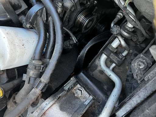 Upon arriving, he opened the hood, checked oil filter and immediately said one of his employees did not properly tighten down the oil filter, leading to significant oil leakage. He checked the oil, added maybe 3/4s of a qt, and also took the filter with him when he left. He did attempt to say that the car “had not lost enough oil to cause the serpentine belt to slip maybe a half of a quart or so”, however I disagreed, there was half of a quart of oil under the car on the ground alone, never mind in the engine bay, and the belt is saturated in oil, INTACT, and off the pulley.