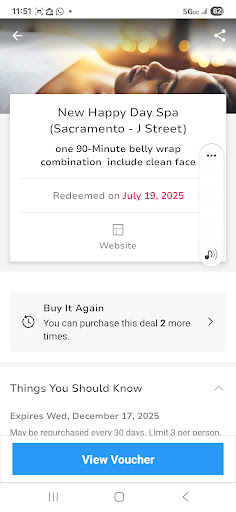 Read moreI googled best massage in Natomas and "New Happy Day Spa" appeared. I am so grateful that I had a massage today! My sciatica, lower back pain, neck pain and plantar fasciitis pain were significantly to fully reduced and I am able to walk without pain. I really loved the heated massage beds/tables. I also liked how the masseuse wore gloves when he massaged the lower legs and feet because it's a smoother feeling massage to me that I observed. I was solo, but noticed they also have rooms for romantic couples massages. My professional masseuse was Jack. Immediately after my massage, I called my husband to get a 90-minute massage with Jack. He sure did! Next time, I will get the 90-minute massage with Jack! The facilities are very clean. The fragrances are very subtle, which I appreciate because I have a sensitivity to fragrances. Also, the administrative team members are very polite and work diligently to accommodate your schedule and ensure the "problem areas to massage" that you communicate to the admin team at the front desk are clearly communicated to the masseuse and are the focal points for your experience. I highly recommend "New Happy Day Spa" across the street from California Family Fitness to your families! Thanks Jack, I feel so...