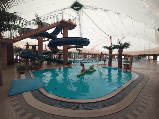The reason I give it 4 stars is because it’s an indoor pool, it smells like Chlorine but you do get used to it, and again an indoor pool does have its advantages in a super hot place like Southern Utah in the summer. Very slippery floors everywhere and all their equipment and air vents are really dusty. If I were them I’d figure out a grippy mat system that could go all over the ground around the pools and then I’d take a hose up the water slide stairs and regularly spray off all those green air vents and fake palm...