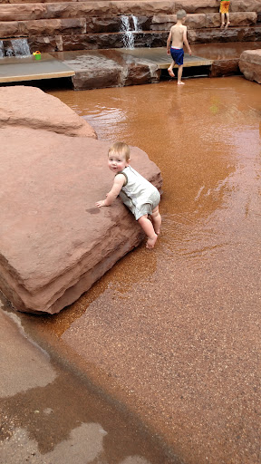 I've taken my kids here dozens of times. It's definitely one of our top favorite places to go when it's hot outside. There's ample room for the littles to run around and plenty of comfortable shady spots with good visibility for the parents. The park features a very shallow river (the deepest place is maybe 5" at most) that stretches about 100' from one end to the other, a traditional splash area with fountains and jets that alternate for some fun variety, a large grassy area behind with a carrousel (I think it's $2 per rider, but it's been a while since we rode it so I could be wrong), and the parking lot is shared with the Tabernacle, the downtown library and the St George Children's Museum (another of our favorite places to go). Everything is beautifully manicured and well maintained, the bathrooms are always clean, and the drinking fountain is actually cold (a rarity in the summer). I'd highly recommend this splash pad to all ages, including babies. As you can see in the picture, the water barely covers my 9 month old's toes, and the boulders are all worn smooth, so no...