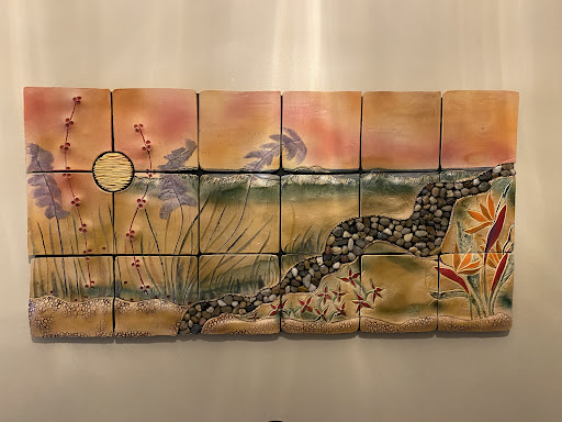 After purchasing some smaller ceramic tile works from Brenda, over the last 3 years, we decided to commission a much more complicated panel. We wanted something brighter and large enough to put in the entrance foyer of our home.