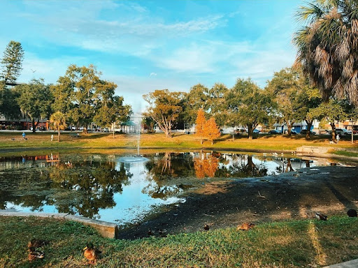 It's a nice park, with lots of HUGE old growth Live Oaks, and one Baobab Tree that is as old as the ones down near Edison's Winter House in Fort Myers..... unlike alot of the local ancient Baobab Trees, this one is not fenced off, and you can meander thru the center of the old stumps on a path that leads to the other side. I saw a mother and her 3 to 4 year old daughter swinging off the vines that hang from the tree (probably not a recommended pass time, but they were havin' a ball in Tarzan like fashion, so who the Hell cares) The park is maintained well, and the grass and grounds kept trimmed... The St. Pete Police keep a good patrol around it, and there doesn't seem to be the homeless and prostitute problems mentioned previously..... there are 4,700 homeless people in St. Pete as I write this today, so where in town are you "not" going to be around them? 95% of them, are not a problem anyhow..... they keep to themselves; some "pan-handle", but not many that I've seen. By the Grace of God, my friend.....that could be you or me..... bring a part of a loaf of bread, by the way, as there are some HUMONGOUS Tilapia that hang out down by the overflow spillway pipe, and a couple of MONSTER Turtles that will come out also. Most of the dog owners that I've seen that come there, clean up after their pets.....and keep them on leashes..... it's a great place to bring your canine friends. This park is very shaded, and a pleasure to take a stroll around. Come...
