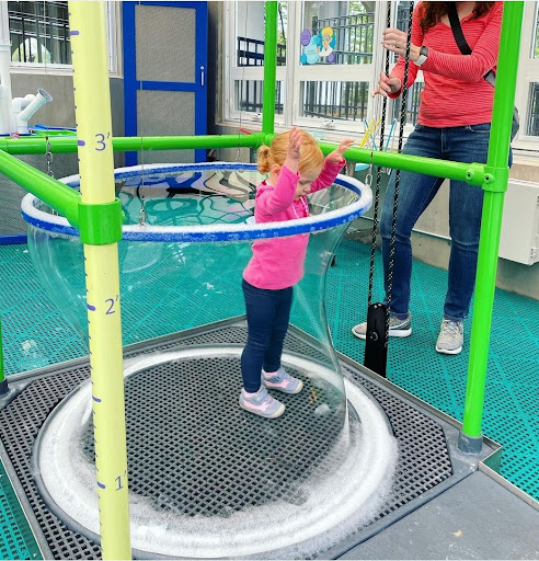 It was incredibly obvious that our toddler's favorite exhibits usually involved bright lights, pretty colors and music, as well as any sensory or fidgety elements and contraptions, and things/places he could climb on. The bubble shed was also a big hit, as were the ball tubes and "Plinko" board at the base of the outdoor Erector Set maze and slides.