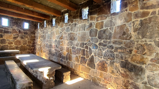 There is the main castle which has stairs to get to the top level (but not to the top of the tower). Nice views, cooler, some benches to sit on. Nice photo angles looking through the windows. I'm sure sunrises and sunsets would be pretty memorable from here. There is another foundation located on the site across from the castle. There are numerous little "pods" that are along the hillsides with picnic tables in them. Great views, relaxing, but so hot! The other building looked cool so we walked over to it. There were long slits for windows. I figured it was something military based. However, upon entering this building, we realized it was...
