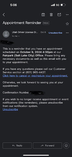Read moreI made an appointment to get a new license in Utah since I recently moved from out of state. I found the location challenging to find, as it is in the parking lot of the Utah Fairpark Grounds. There is no sign for the Driver’s License Division on the main road. When I visited, there were signs for Repticon and what looked like a ticket booth at the only open entrance, so it took me longer than expected to find the Drivers License Division. I ended up arriving late to the appointment, but the receptionist was kind, and processed my appointment ticket anyway. The staff called my ticket number quickly, but when I told them I needed a new license since I am from out of state, they told me there was not enough time to do so. The supervisor came over and informed me that my appointment was made for a duplicate license, and they were not able to do any new licenses starting at 4:30, which is when my appointment time was. They showed me how to make the correct appointment online, by clicking on the “I have an out of state license” button, and I had done the same thing when making my appointment online. I am assuming it must’ve been a computer fluke or issue when I was making the appointment. Has anyone else had this issue? I made a new appointment at the DMV in Draper and my main critique is the contrast in comprehensiveness between the two locations when making the appointment. My confirmation email for the Fair Park location had only provided my appointment time and confirmation number, while the Draper branch confirmed that I had made an appointment for an original license, the time of the appointment, the location of the appointment, and other helpful information.