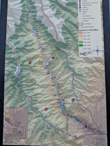 Absolutely wonderful area to walk, hike, explore, jog, bike ride, and take the dogs out for a walk. Lots of trails for all fitness levels. Guards at gate are friendly and helpful when available. Numerous trails available which are not on any maps. A variety of animals roaming at times if you happen to be lucky enough to spot them. Lots of picnic tables, restroom, and water fountain for use on paved road near the stream. Nice place to relax near the stream at the picnic tables at times. The tables are located about 3 every 1/2 mile on paved road. The road is 5 miles up to the rotary club park. There are 30 picnic tables up to the end at 5 miles which evens out to roughly 6 per mile and 3 per a half mile. There are some markers for the first 2.5 miles that mark each 0.5 miles up road from the guard post. During main season around June to October they alternate days between allowing cars and bicycles on the road. Even days are cars since most holidays are on even days. Odd days bicycles are allowed. Pedestrian are allowed any times. The area is open daily until 10pm. The restrooms close at 6pm during off-season and 10pm otherwise. During off-season both bicycles and pedestrian are allowed to use paved road and it remains closed to vehicles except for the main season. A few miles away for one week only in October there are deer hunting. Water is turned off from around December? until May due to weather and freezing of pipes. A must visit in fall when the leaves change color and at sunrise or sunset and view the color of rising/setting sun across the valley to the South.