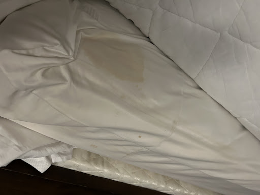 The room itself looked and felt neglected. Above the bed, wallpaper was peeling off in large patches, and the bed itself had a metallic clank each time we got in or out. The pillows and sheets were visibly worn, with several stains. Adding to the charm, we found food crumbs from a prior guest left on the bedside table.
