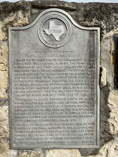 Just north of Mission Espada is the Espada Aqueduct. The Espada Aqueduct was constructed in 1745 by Franciscans to serve Mission Espada and the surrounding area. The Espada Aqueduct brought water traveling in an acequia from the San Antonio River over a low elevation creek, to maintain the elevation and potential energy of the water. This potential energy would carry the water from its original exit point on the San Antonio River to the farmlands of Mission Espada. The acequia system at Mission Espada is the most complete and original acequia system...