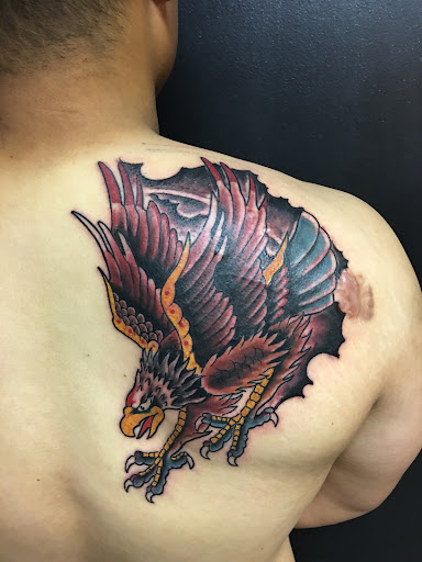 Read moreWell me and my friend have visited this place a couple of times and have always had a great time till i went the last time. I decided I wanted to get a soldiers cross and put my drivers name to it, he died of gulf war syndrome a basically rotted from the inside out. It . Certain parts of it weren't finished and one of the boots if you look didnt have any outline where as the other boot does the helmet looks jacked up. My artist walked away from doing my ink and went out back with some guy for maybe 15 mins. That day I spent almost 1000.00 dollars and wasn't pleased mine looked like a 100.00 tatt my friends turned out good. I'm going elsewhere to get it reworked. The lighter one is while I was still there and the darker one was after...