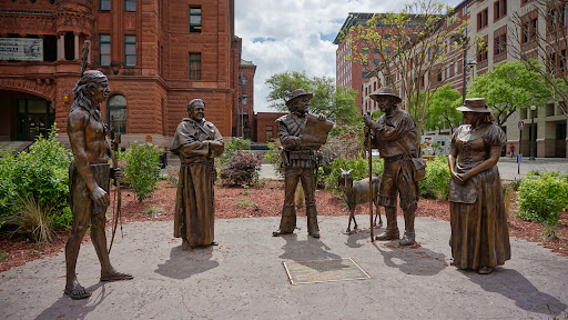 The figures in this monument, created by Armando Hinojosa, represent the four founding communities of San Antonio - American Indians, Franciscan friars, Presidio soldiers, and Canary Islanders. As early as 1691, Spanish explorers recorded insightful information on various American Indian tribes in the area, whom the Spanish collectively referred to as the Coahuiltecans. Later tribes included the Lipan Apaches, the Tonkawa, and the Comanches. Colonial settlement began in 1718, with the establishment of the Presidio San Antonio de Béxar and the Mission San Antonio de Valero (now called The Alamo).