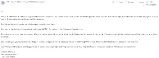 Read moreI have never worked or tried working with a vendor with such unprofessionalism. We had reached out to the venue a week ago and all correspondence then (phone/email) had been fine, we even toured the venue and the person we met with was pleasant. On the night before submitting our documents to secure their supposed last date for 2025, we were met with this email (included). We had some specific questions regarding lines or statements in the rules and regulations which we had read a few times that we wanted to make sure of, noise levels *since you know at weddings, people typically dance, culturally we're Mexican, so we wanted to ensure our culture could be represented through mariachi, etc. We had a few questions because during the walk through we heard comments and things said that contradicted what was stated in the rules, so we wanted to be sure. After that email we were definitely sure that we would never use this venue or ever recommend anyone to use it. Such a beautiful space, held hostage by someone really nasty, possibly racist. Save your...