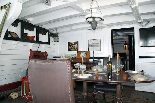 Originally the HMS Rose, this vessel is a relatively faithful replica of an 18th century 24 Gun British Imperial Navy Frigate. Thus, the headspace and all things below the deck reflect the way these ships would have been built and operated (hammocks and tables slung between or over cannon).