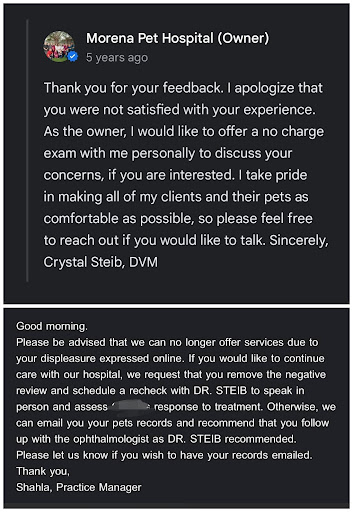 However, I will not be taking my dog back to this vet because I told them I needed a certain type of heart worm medicine that I could only order through 1-800-Pet-Meds. 1-800-Pet-Meds needs vet approval before they can ship any perscription. Morena informed me to bring my dog in for a $40 heart worm test and if his results came back negative they would give the approval to 1-800-Pet-Meds.