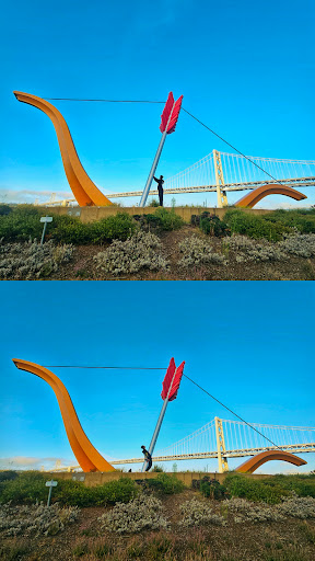 Read moreAfter taking my 3 and 8 year old grandsons on the ferry from Alameda to San Francisco for the first time, we headed toward Cupids Span. It is what is most visible on the skyline with the bright red "feathers" of the arrow standing almost vertical. The kids and I skipped up the pathway to the giant bow and arrow.