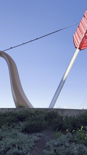 Cupid's Span is a striking sculpture in Rincon Park along the Embarcadero in San Francisco. Installed in 2002, it was created by the married artists Claes Oldenburg and Coosje van Bruggen, renowned for their large public sculptures that transform everyday objects into captivating art.