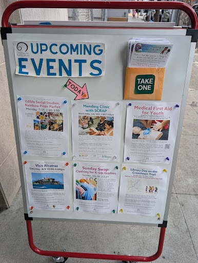 This library is a short walk from Glen Park BART station and a bevy of bus stops, restaurants, and small businesses. It doesn't look like there would be a sizable library from the outside, but when you take the elevator or stairway lined with art up, you realize that it's above the grocery store.