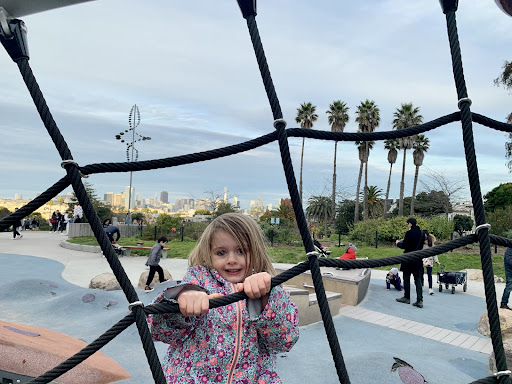 Read moreGreat city park with huge play area, fields, bathrooms, and view of the SFO skyline. Park was busy with people on a blustery, cold day in January. So probably quite busy on nicer days. Playground is a bit adventure-y. Some more risky climbing and running allowed. There's a sand area and toddler zone. Swing sets, a couple slides. Nicely laid out. My personal gripe is the boulder rocks spread throughout the area, embedded in the design. I never understand these...all it takes is for a sprinting kid to trip and smash headlong into any number of these boulders. TBI in the making. I get it. Kids need to learn how to navigate their world. These rocks though seem a poor choice of helping them learn. Thankfully, as I observed the area with my kids and all those playing, no one got injured. A few close calls...but that's life isn't it? Definitely a great park for pretty much...
