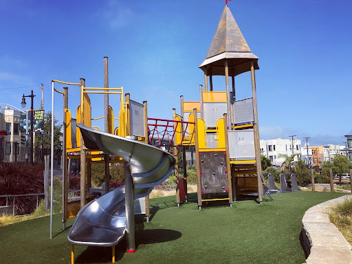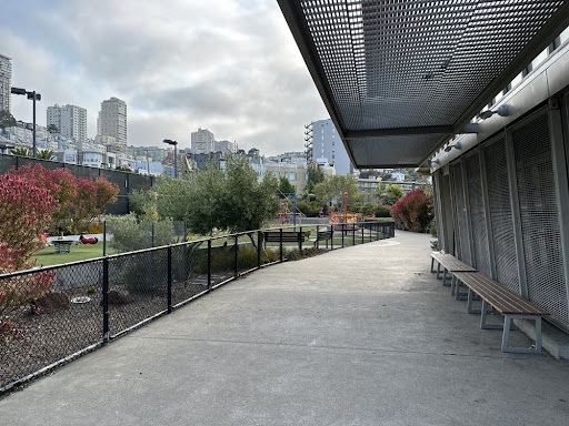 Located right along the cable car line, this fun play area with rec opportunities is a perfect addition to a SF day plus it’s walking distance from Fisherman’s Warf. Along with the shiny play structure and fun playground elements, this park has a full and two half basketball courts, tennis courts, volleyball courts, four square, bocce ball courts, an indoor swimming pool, and a library. The play area is completely gated in inside the already gated in park (double security for the runners 😅). There is a huge climbing dome with sideless bottomless slide, a climbing merry-go-round, a spinning cup, bucket swings, a swinging meets teeter-totter (so much fun!), and a mosaic fish sculpture that you can climb in and on. The play structure is on a higher level of the play area and is accessible by a ramp or amphitheater-style steps has two slides (a spiral and a double), steps, ladders, a sliding pole, a bridge, activities, a small and climbing wall. The double slide is long and goes from the structure through the amphitheater-style steps to the lower level of the playground. Nearly all of the flooring at this park is astroturf. There are bathrooms....