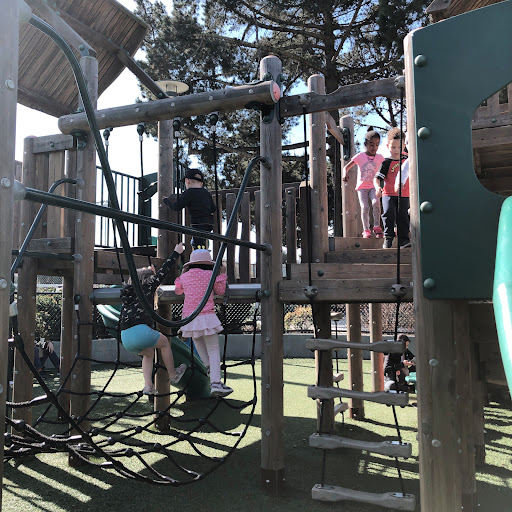 Had to take my hubby to Kaiser a few blocks away and didn't want to torture my 2 yr old by making him wait in the car for possibly up to an hour. For being in a somewhat "rough" area this is a really nice and a lot of thought clearly went into this playground! I only say that because it is in the heart of the Fillmore and while the entire playground is gated, there were still some sketchy characters on the Geary side of the park where it seems a couple people are living out of their cars and also on the overpass that you HAVE to use to cross Geary on foot. I parked on Geary but noticed there was a TON of parking there which I assume was mostly because of the small homeless population. However I never felt awkward and didn't mind parking where I did because the people living in their cars seemed pretty harmless (no obvious drug/alcohol useage, aggression etc) and I didnt feel the least bit worried mostly because it is a very populated area and for a Sunday afternoon there was a lot of people and kids around. But I did notice that a 30something white guy had called the cops and they appeared to look around the perimeter of the playground (cops greeted kids that yelled hi but no stickers😉) but I'm assuming never found their suspect. Didn't notice anything came of it but a I'm born and raised SFer so I wasn't really alarmed by it as like I said it is the Fillmore. Had to note that because I think some people wouldn't have been as comfortable as I was because like I said I'm born and raised in the city, so none of this is new to me but I'm also a parent now so you do keep a mental note of these things and know when/where you need to be a little extra vigilant. There are 2 structures one for smaller kiddos and toddlers and a bigger slightly more advanced one for bigger kids, and big enough for an Adult to follow a rambunctious daring little one. My 27 month old LOVED this park and while he didn't play much on them, he was fascinated watching older kids (7/8+) climb on the "rock climbing" rope structure..its basically a tightrope between two kid friendly "rocks" and there are a couple of these around the park for kids to play on/in. There are tons of things for kids of all ages to safely do while in the fully...