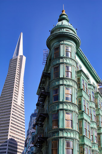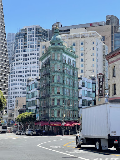 Read moreIl Sentinel Building, noto anche come Columbus Tower, è un'icona architettonica di San Francisco situata all'angolo tra Columbus Avenue e Kearny Street, nel quartiere North Beach. Con la sua caratteristica facciata color verde rame, è uno degli edifici più riconoscibili della città. L'edificio fu completato nel 1907, poco dopo il devastante terremoto del 1906. È stato progettato in stile Beaux-Arts, con una base triangolare che ricorda la celebre Flatiron Building di New York. Negli anni '70, il Sentinel Building fu acquistato da Francis Ford Coppola, il celebre regista, che vi stabilì la sede della sua casa di produzione, American Zoetrope.