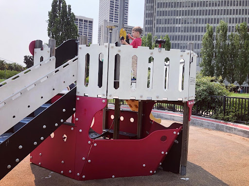 Just took the ferry to the city from the east bay? Want to explore a little? Across The Embarcadero is Sue Beirman Park full of grassy lawns, a huge water fountain, and a playground. The playground is gated and has two structures, a giant climbing dome (with lope ladders and more), swings (bucket and standard), teeter totter, and spinning cup. The smaller structure is shaped like a boat! There is a slide, steps, rope ladder, hammock underneath, a look out deck up top with wheel and binoculars, and benches inside. The larger structure has a long slide and a bottomless sideless slide, steps, rock climbing, and monkey bars. Across the grass is the GIANT water fountain that you can walk under and take steps up to the top. (Definitely don’t go in the water thought 🥴) While there aren’t bathrooms close to the playground, it’s right across from the ferry building which has bathrooms as well as food and coffee options. The kids have never been to the city and it was really neat for them to see the buildings so close that we see so far away when we are exploring...