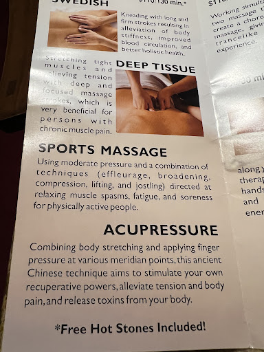 Read moreDO NOT GO HERE My masseuse was ok but didn’t speak a word of english which is no problem, in the middle of a massage she walked away and I was like am I supposed to leave? What’s happening then came back after a couple of minutes. the place is so gross, they charge you prior to going in so you don’t know what you’re dealing with but I’m so disgusted and congested from all the dust and mold and everything that was in it. I am about to take a Clorox shower I’m so grossed out. Didn’t even ask me which part I need them to focus on. People seem to be so cold, rude and constantly speaking another language. The place smelled so freaking bad, didn’t even feel like you were in a massage place, toilet smells better than this place. Look at that carpet! Gross and what’s up with them fingering your ears. Never had that massage done I hope I don’t get an ear infection. Close your spa this should be illegal. Change your carpet and use good smelly oils not a vegetable oil....
