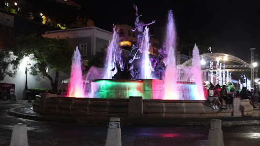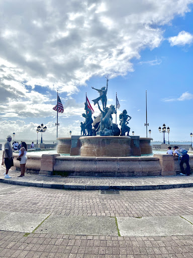 Fuente Raíces is located at the end of "Paseo de la Princessa". The central figure is a goddess soaring into the sky, representing freedom. Surrounding elements include a horse emerging from the sea, symbolizing Puerto Rico as an island; two adults with a child, representing the Puerto Rican family; dolphins and a nymph, symbolizing hospitality; a jibaro and a black woman, representing African culture; and the central goddess, symbolizing freedom. The fountain is situated at the end of the Paseo de la Princesa, a scenic promenade in Old San Juan, offering picturesque views of San Juan Bay and the historic city walls. It is a popular spot for both locals and tourists, often serving as a backdrop for photographs and a gathering place for cultural events and...