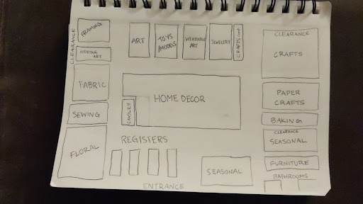 Departments; Map is attached as well: {Floral/Sewing/Fabric/Needle Art/ Framing (Custom as well)/Art&Crayola/Toys/Models/RC/Jewelry/Jackets&T-Shirts/Wearable Art&TyeDye/Crafting:[Glass/Clay/Wood]/Paper Crafts/Baking/Seasonal}