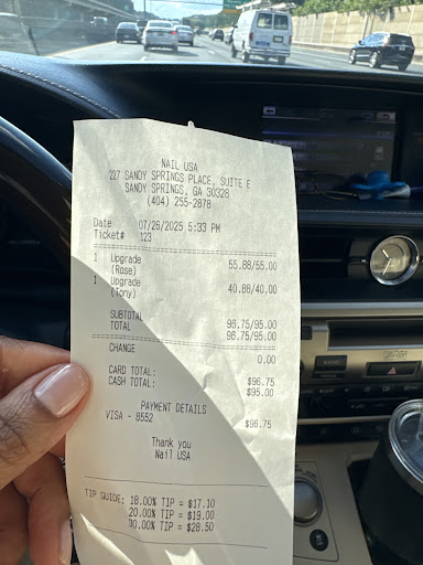 Read moreIf your name isn't Tom, Susan or Chip and give $20 tips your SOL!! The woman who started my nails asked me could I wait for the young man to get finished with a customer and he would finish me, I said no ( he looked between 13 and 15). So I guess that's why I got a rushed fill in. She never removed all the color even though she said she would when she filed them. I had to get all black just to cover the black that was left on them. I asked do you file under the nails NO, I asked do i wash my hands she said Later. Well after the oil was put on I asked do I wash my hands at home she said YES! I then asked am I ALOUD to wash my hands she then said yes! If your income is not in the hundred thousand dollar range this place isn't for you. There was also another lady ( similar to myself) who had 3 different people working on her. 2 were taken away from her to do their "regular customers" they knew by their first names! This woman was seated way before me and the lady( I assume owner) that did me had to finish her. At least she asked for and was given a discount for her inconvenience. We both said we would not be back!! I paid my $40 just to get out without my hands looking a mess, knowing I'll be somewhere else tomorrow getting them redone. I've been getting my nails done for over 20 years so I definitely know when I'm being short changed on...