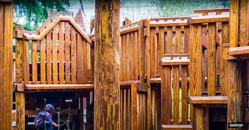 Wonderful outdoor play structure constructed primarily of wood and adorned with fun murals surrounded by vegetation. Swings, slides, climbing obstacles, and variety in structure had our 2yr old thrilled. Its design makes for very few long falls, which is reassuring for parents of younger children. It is large and only partially fenced in, which is not reassuring for parents who have adventurous children, so not a great place to let them run off and supervise them from a sitting position.
