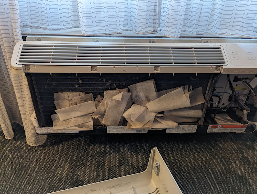 I generally hate leaving negative reviews but I feel compelled to warn others after my experience here. I am just glad I was travelling solo and not with my family or anyone with asthma or other respiratory vulnerabilities. In short, I believe this hotel has a mold problem. After sleeping here a few nights I started waking up with respiratory irritation and started poking around the room. The bathroom had a strong "damp" smell I'd been ignoring, but that didn't seem bad enough to cause what I'd been experiencing. I noticed something sticking out of the A/C unit so I took the cover off and found that at some point someone had shoved an entire package of dryer sheets inside, and they were damp and moldy. I was pretty horrified I'd been breathing air filtered through that for several nights. The hotel staff was very accommodating and kind and offered me a second room, but when I looked at the a/c unit in the second room I was dismayed to find that it was completely covered in mold growth. They offered me a third room and the front desk person even walked around with me to find one with a brand new a/c unit, but at that point I was so skeeved out I simply left and booked a room at the DoubleTree across the street. I'm not a mold expert, but multiple rooms with mold problems on different floors and sections of the hotel is not a good sign. I won't be staying here again unless I get news that the management has had the building evaluated for mold and a remediation performed if found necessary, and changes are made to how the air conditioning systems are maintained. It was clear that the hotel just runs the A/C units until they break and then replaces them with little to no cleaning or maintenance in the interval between, otherwise I as a customer wouldn't have been the one to discover multiple units with serious problems. Mold is a serious respiratory hazard. As I said at the beginning. I'm just glad my kid wasn't with me.