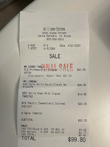 Read moreI had a very unpleasant interaction with an employee at this location yesterday, April 21, 2025. I was there to purchase a gift for my mother’s birthday in the afternoon around 3 pm. I gathered up several items and brought them to the front to purchase, including a PLB Professional Chopper. The chopper was tagged at $21.50. When my items were being rung up she scanned the chopper in at $74.99. I said that is incorrect, as it is priced at $21.50. She said no, that is not the price and continued to scratch off the tag as if I had placed a tag over the actual price. I was a little irritated by her implication and her refusal to honor the marked price. I suggested that we go back and look at the other boxes to double check and we did. She seemed to be extremely upset when she realized that every single box was marked at $21.50. She walked hastily back to the register and honored the price but was extremely rude to me prior to the end of the transaction. She was very condescending at this point and told me this will be a final sale and stamped my receipt with a big red final sale seal. She was not pleasant at all and did not thank me for stopping in. It was very awkward as there were other employees around. I have been coming here for years and have had such a negative experience. I don’t think this employee should be a representative of Williams-Sonoma. I believe an apology for her abhorrent behavior...