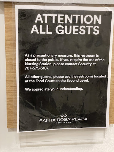 My friend and I came here today to hang, shop, and grab a bite to eat before heading to the train back to San Rafael. Before we left my friend (who is trans) needed to use the restroom, after we realized there were no "gender neutral" or "family bathrooms" near the food court we followed signs that took us downstairs to the main level, along a very long hallway only to be met by 2 traditional restrooms, a nursing station, and a locked gener neutral bathroom with a number to call.