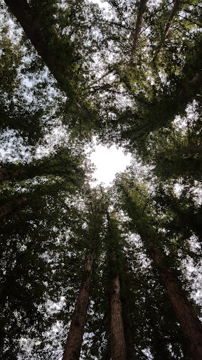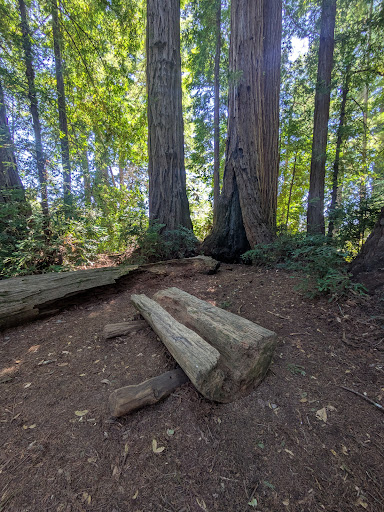 July 2025 Gorgeous coast redwoods in a circle, surrounding a small area. The cooler temperature among the trees allowed us a snack and rest break.
