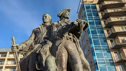 This historical point is located in the middle of a beachside walk promenade in Seaside Oregon just off of highway 26. This statue is located in the middle of a traffic circle that acts as more of a drop off point than a drive-to location. Chances are that you'll have parked a few blocks away at the convention center and walked up a couple streets to get here. It's not a far walk, and this would be a solid meeting point when locating friends or family. Many of the coastal town's restaurants and local shops are tucked into the buildings near by. The Oregon coast restaurant staple, Moe's clam chowder, is located next to here inside the Shiloh Inn. Again, don't park there unless you're staying at the hotel itself. There is beach access and public restrooms located here. Just south of the statue is a ramp that's perfect for getting to the sand with a beach cruiser or stroller... there's no need to ride down the stairs. Also near by are public swing sets on the sand overlooking the ocean... a perfect location for the day's end, as nothing beats a West coast sunset... Few things of note. Bring a seasonally appropriate jacket or parka. It gets windy. And there's no driving or fires on this beach. Plenty of places rent beach bikes. It's really fun to take a tandem...